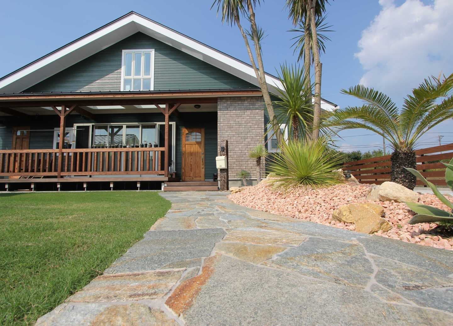 お施主様こだわりのドライガーデンと天然石のアプローチで、建物と上手く調和のとれた仕上りになっています。