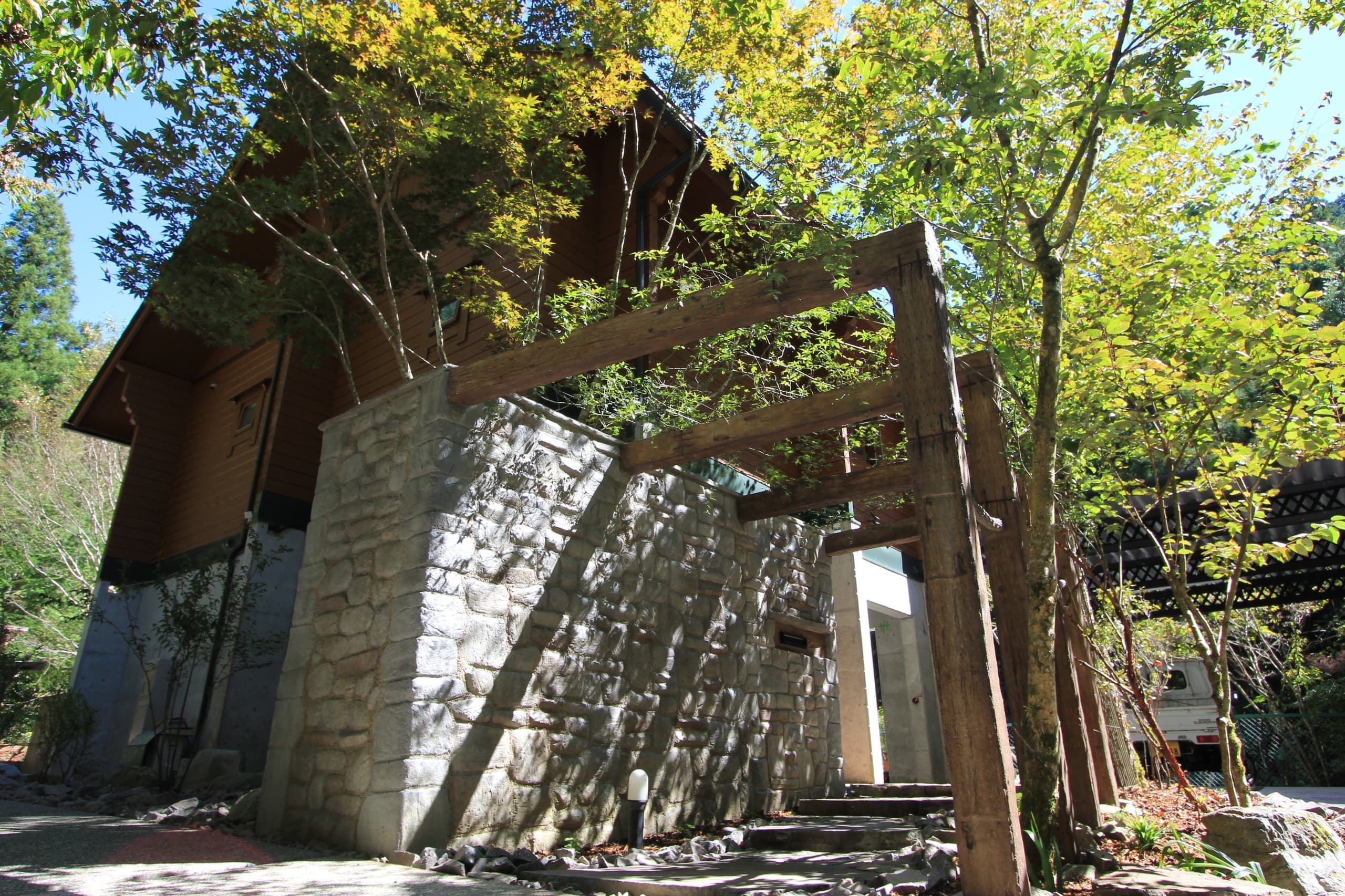 建物のデザインやお店のコンセプトを考慮して、自然素材をふんだんに使い、オリジナルのテラスやお店のシンボルとなる看板にモルタル造形の仕上げを施し、アクセントとしました。